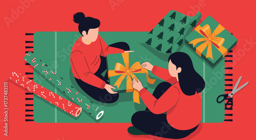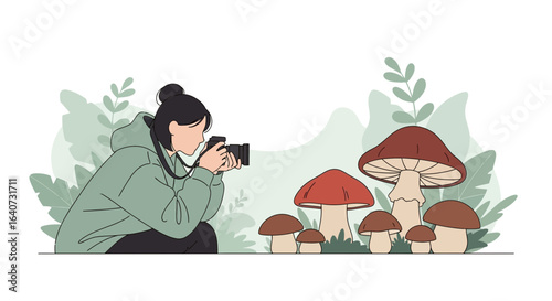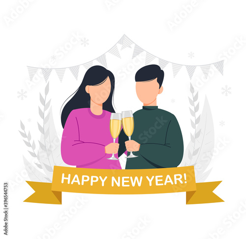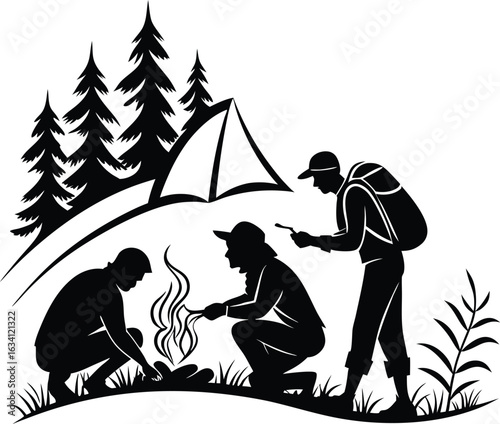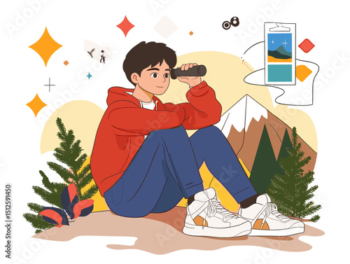 Счастливая романтическая пара наблюдает за восходом солнца, сидя на поваленном бревне в лесу, плоская векторная иллюстрация. Туристы с рюкзаками отправляются в пеший поход, кемпинг, треккинг. Летний отдых на свежем воздухе, туризм, путешествия.