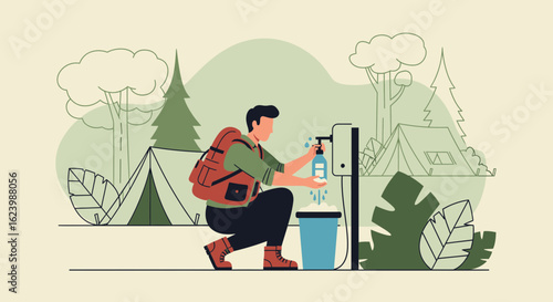 Счастливая романтическая пара наблюдает за восходом солнца, сидя на упавшем бревне в лесу, плоская векторная иллюстрация. Туристы с рюкзаками совершают пешие прогулки, кемпинг, треккинг. Летний активный отдых на природе, туризм, путешествия.