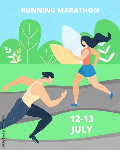 Бегущая пара в парке. Векторная иллюстрация концепции спортивного фитнеса в плоском мультяшном стиле. Элементы дизайна и иконки. Здоровый образ жизни.