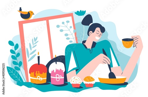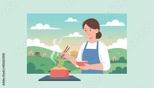 Дизайн целевой страницы русской кухни, набор шаблонов баннеров веб-сайта, плоская векторная иллюстрация. Женщина готовит традиционные русские блюда - борщ и блины. Водка алкогольный напиток, старинный самовар.
