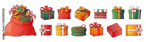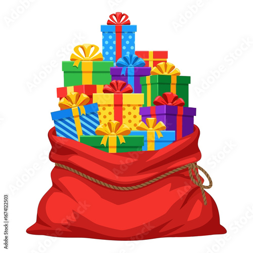 Мешок с большим количеством рождественских подарков векторная иконка, изолированная на белом фоне.