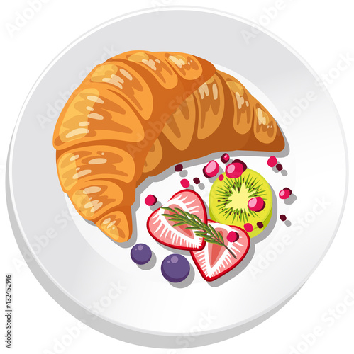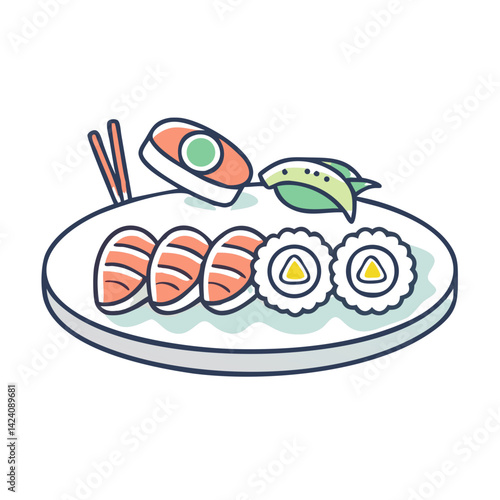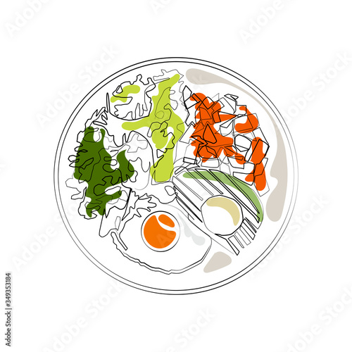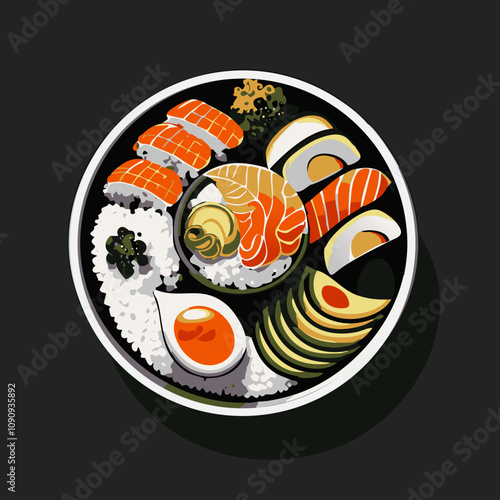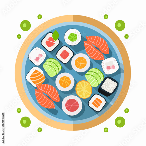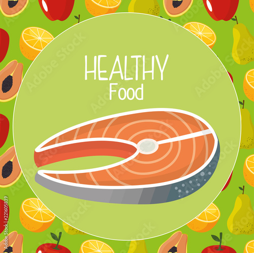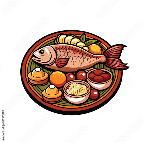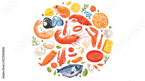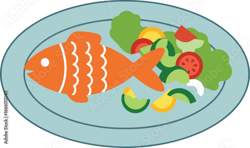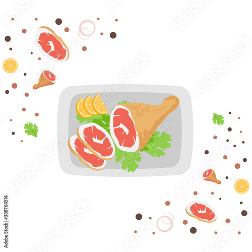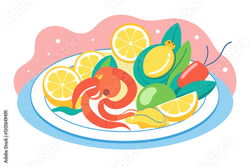 Стейк из красной рыбы лосося с ломтиками лимона, перца, помидоров и пряной травы на тарелке, векторная реалистичная иллюстрация вида сверху. Композиция из жареных или приготовленных на гриле морепродуктов для меню, рецепта, веб-баннера.