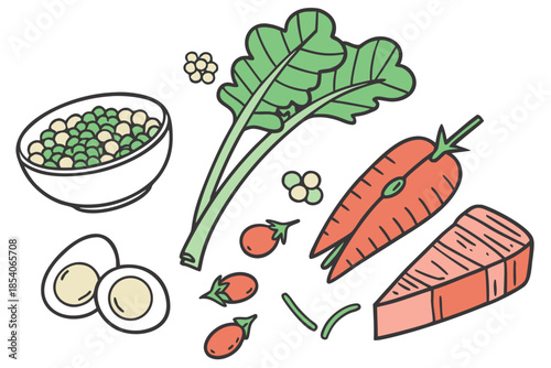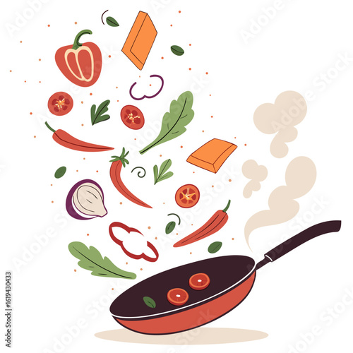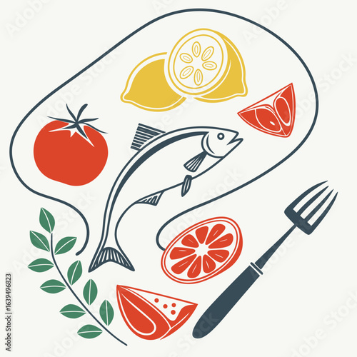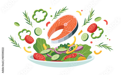 Стейки из красной рыбы лосося, филе с ломтиками лимона, перцем и пряной травой розмарин, падающие на сковороду, векторная иллюстрация. Приготовление вкусной полезной композиции из морепродуктов для меню ресторана, рецепта и т.д