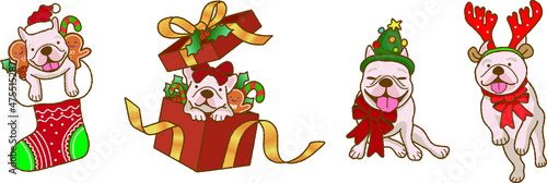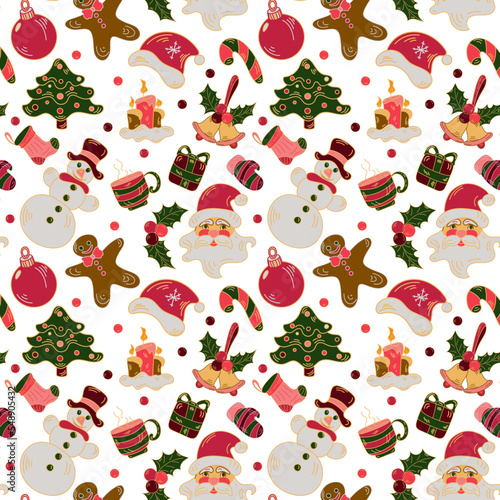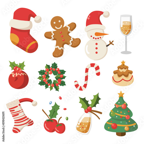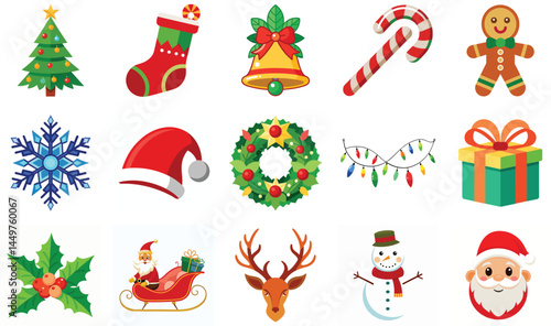Набор мультяшных персонажей Санта-Клауса, плоская векторная изолированная иллюстрация. Милый Санта с рождественской елкой, северным оленем, венком, безделушкой, бенгальскими огнями, мешком, полным подарков.