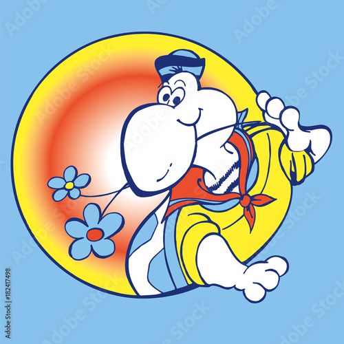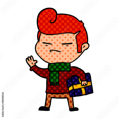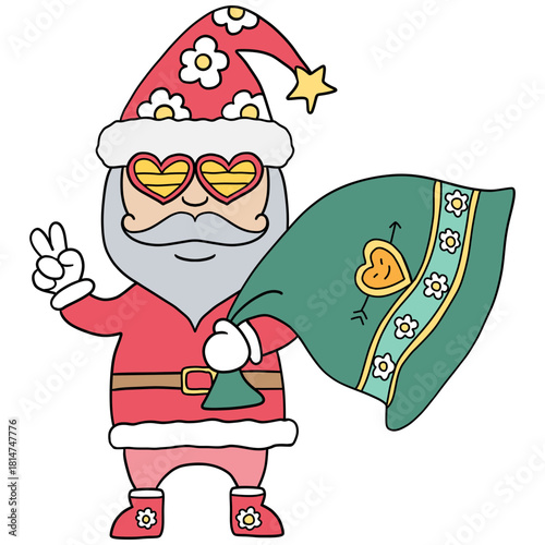 Санта приколол девушку в голубом платье, держащую сумку с подарками. Векторная иллюстрация в стиле комического поп-арта. Концептуальный плакат рождественских праздников.