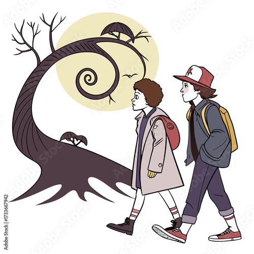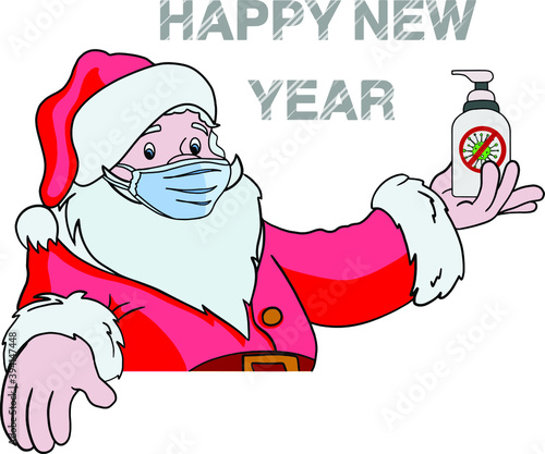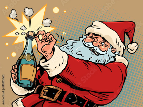 Санта приколол девушку в голубом платье, держащую сумку с подарками. Векторная иллюстрация в стиле комического поп-арта. Концептуальный плакат рождественских праздников.