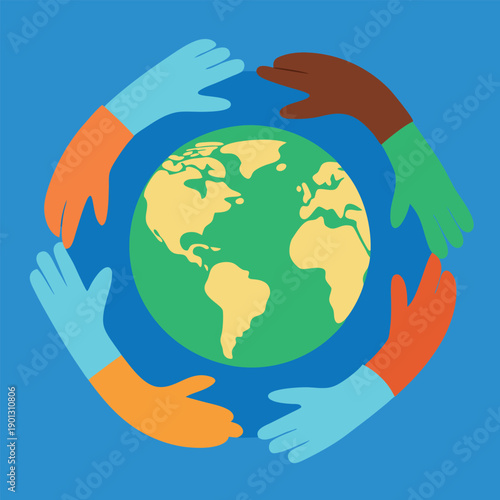 Векторная иллюстрация "Спаси землю". Человеческая рука тянется к глобусу над дизайном карты мира. Концепция защиты окружающей среды и культивирования экосистем. Всемирный день экологии планеты