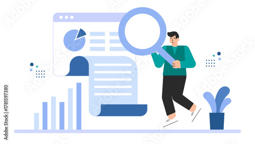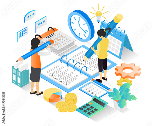 Сохраните вектор времени. Концепция производительности. Мужчина-фрилансер работает за ноутбуком, сидя над деловым документом рядом с изометрическим 3d-дизайном в виде песочных часов