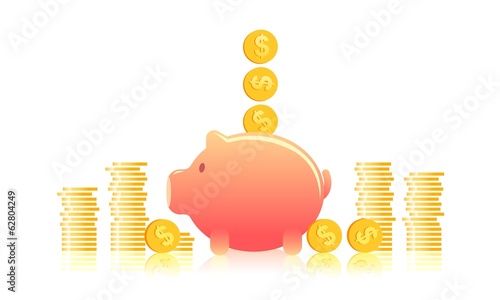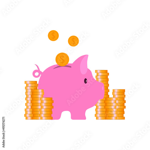 Векторная иллюстрация концепции экономии денег. Розовая копилка с грудами золотых монет на заднем плане.