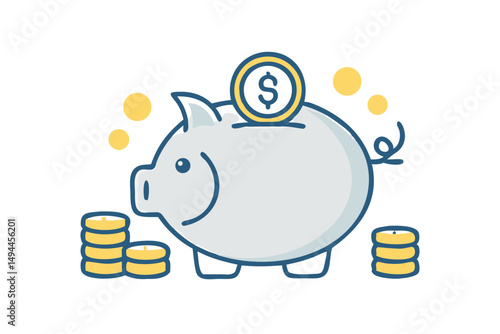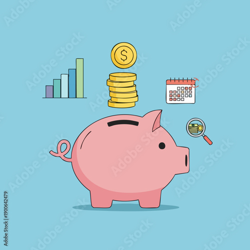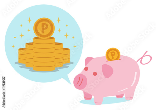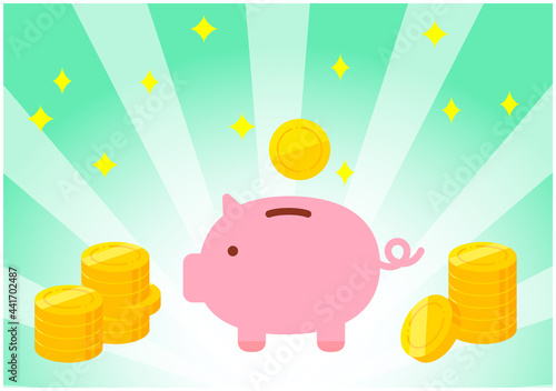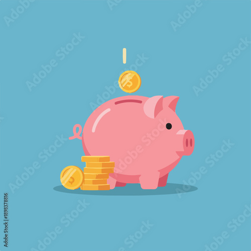 Векторная иллюстрация концепции экономии денег. Розовая копилка с грудами золотых монет на заднем плане.
