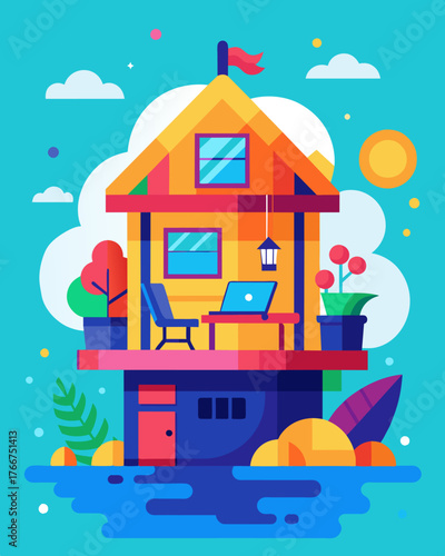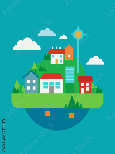 Экономия с помощью векторной плоской иллюстрации концепции умного дома. Дом с автоматизированной домашней охраной, освещением и другими системами, управляемыми дистанционно, долларовые монеты падают из здания в человеческую руку.