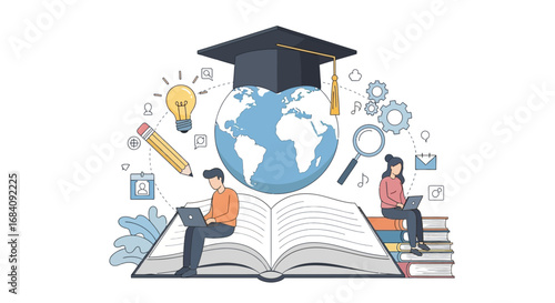 Школьная сумка с выпускной шляпой и канцелярскими принадлежностями, студенты мальчик и девочка с рюкзаками, стопка книг, плоская векторная иллюстрация. Школа и образование.