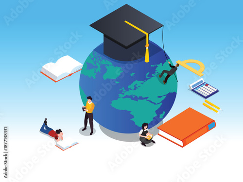Школьная сумка с выпускной шляпой и канцелярскими принадлежностями, студенты мальчик и девочка с рюкзаками, стопка книг, плоская векторная иллюстрация. Школа и образование.