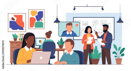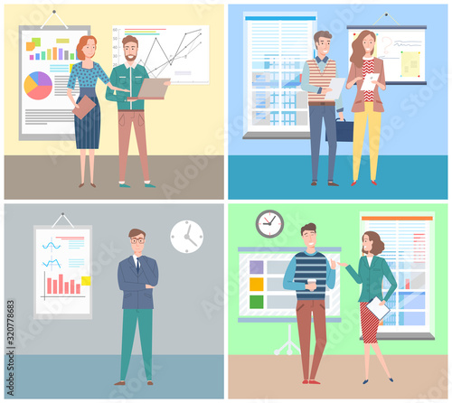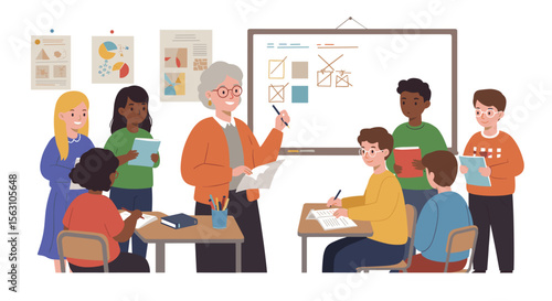 Декорации школьной столовой, плоская векторная изолированная иллюстрация. Школьники обедают, сидя за столом, стоят в очереди, несут поднос с едой, покупают закуски в автомате по продаже продуктов питания.