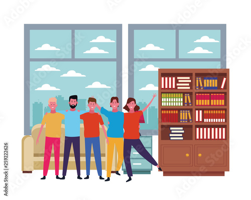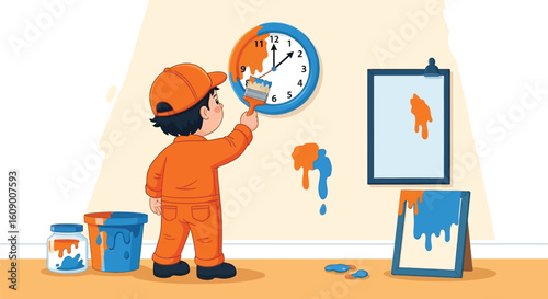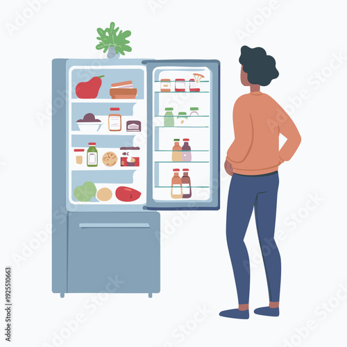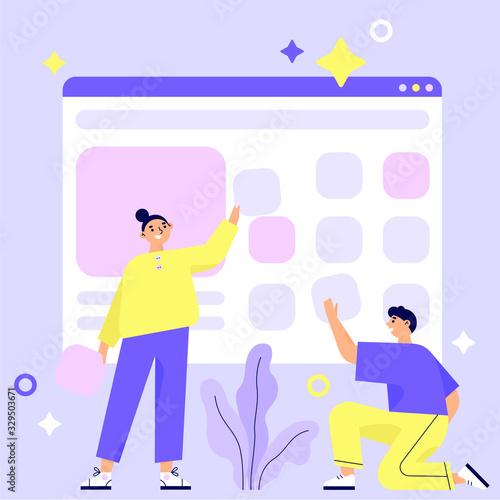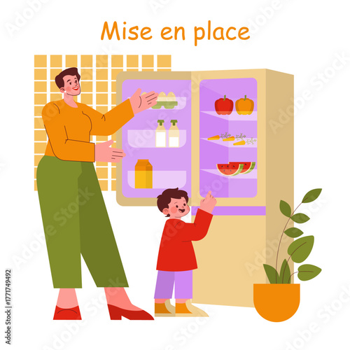 Школьная столовая с персоналом и детьми, обедающими, плоская векторная иллюстрация. Школьная столовая, буфет, интерьер кафе с мебелью, автомат по продаже продуктов питания и обедающие ученики.