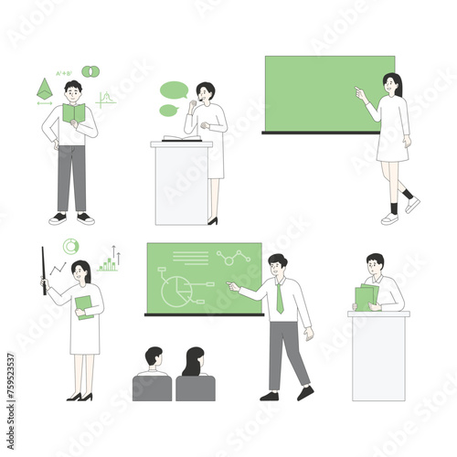 Векторная иллюстрация женщины-учителя с указкой, стоящей рядом с классной доской, ученики, директор школы в своем кабинете. Символы школьных людей, значки, выделенные на белом фоне. Дизайн в плоском стиле.