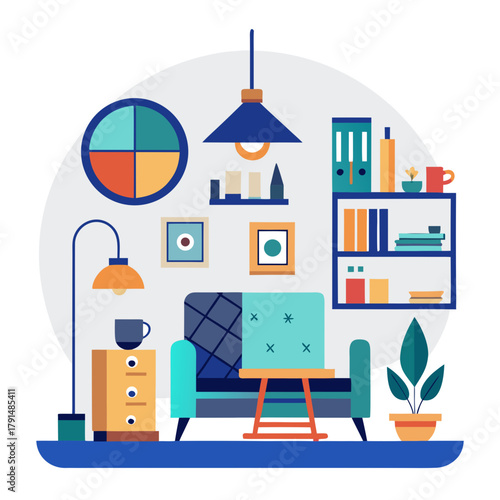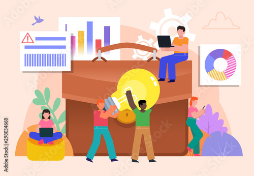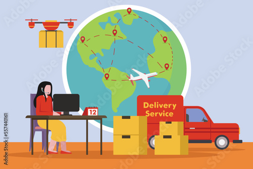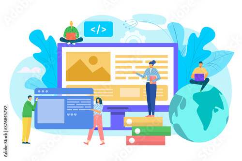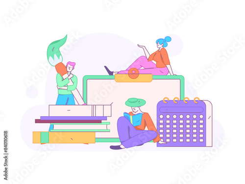 Школьное образование. Учительница-женщина с указкой, стоящая на стопке книг, плоская векторная иллюстрация. Вернитесь к сцене школы, колледжа или университета с крошечными персонажами и гигантскими канцелярскими принадлежностями.