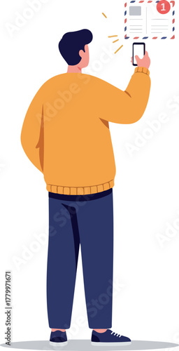 Школьник с открытой книгой, вид сзади, векторная иконка, изолированная на белом фоне
