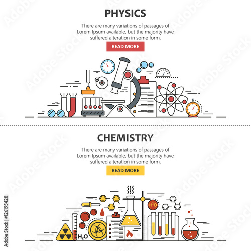 Векторные концепции научного баннера в линейном стиле. Элементы дизайна химии и физики, символы и значки. Лабораторное рабочее пространство и научное оборудование. Уровень образования