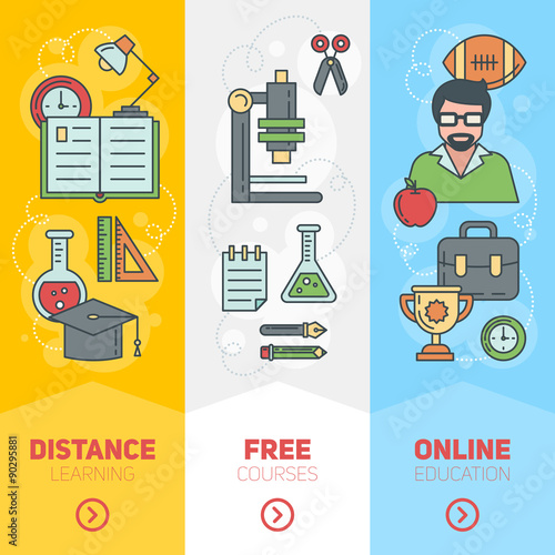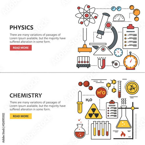 Векторные концепции научного баннера в линейном стиле. Элементы дизайна химии и физики, символы и значки. Лабораторное рабочее пространство и научное оборудование. Уровень образования