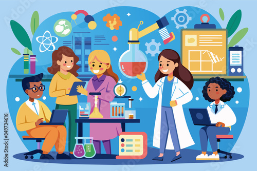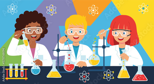 Наука для детей. Мультяшный ученый показывает детям химический эксперимент в лаборатории. векторная иллюстрация.