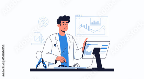 Векторная иллюстрация счастливого ученого мужчины с пробиркой. Концепция Science people элемент дизайна в плоском стиле, значок, выделенный на белом фоне.