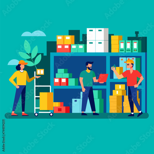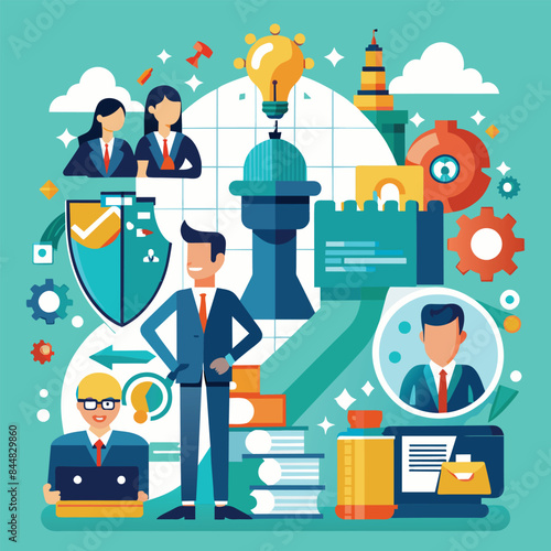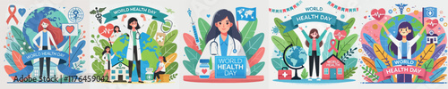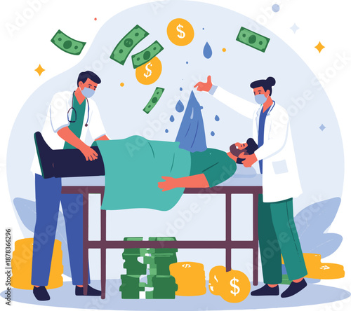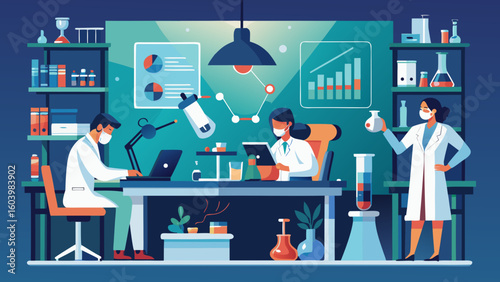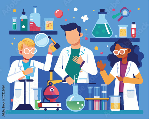 Шаблон векторного плаката "Люди науки". Группа ученых-медиков в лабораторных халатах, масках для лица работает в научной лаборатории с лабораторной посудой под микроскопом. Научное исследование, тестирование, плоская иллюстрация