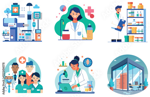 Векторная сцена науки. Ученый, проводящий исследовательский эксперимент в наборе иллюстраций химической лаборатории. Химия, клиническая лаборатория. Врач, эксперт и исследователь, тестирующий вакцину