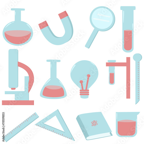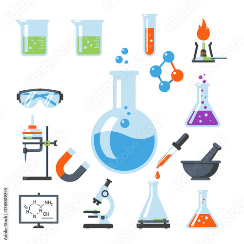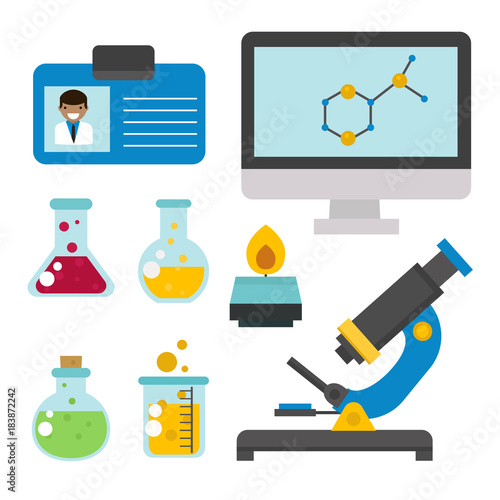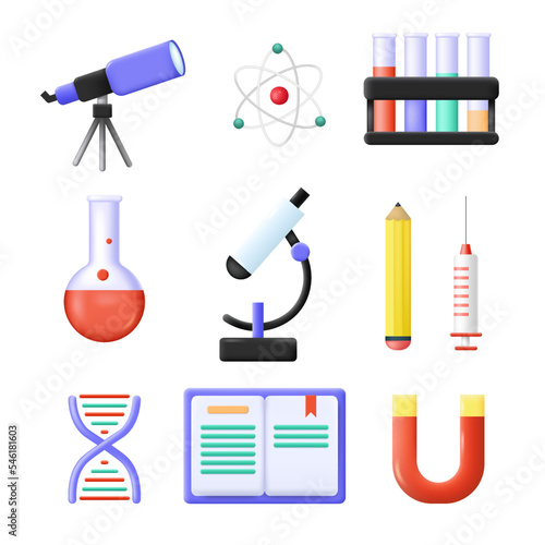Научный векторный 3d-значок. Набор для исследований в химической лаборатории. Молекула днк, атом, микроскоп и медицинское испытательное оборудование - изометрический символ. Концепция биологии, биотехнологии и химического анализа