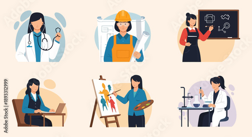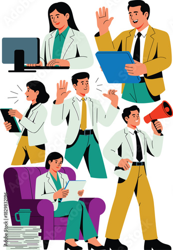 Векторная иллюстрация набора персонажей ученых и исследователей. Мужчина-женщина-биолог, химик, физик, врач, проводящий исследования, проводящий химические эксперименты, обучающийся и изучающий биотехнологию