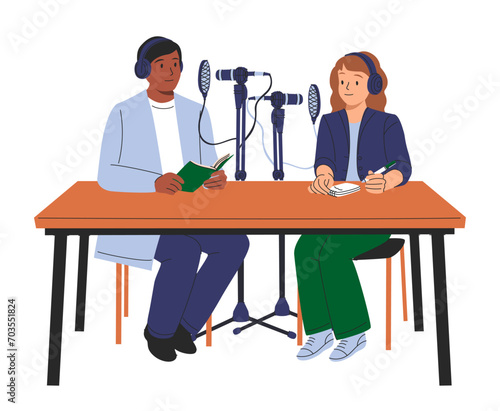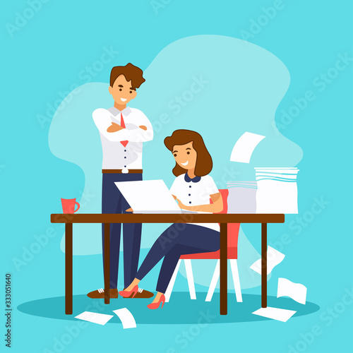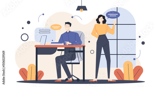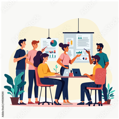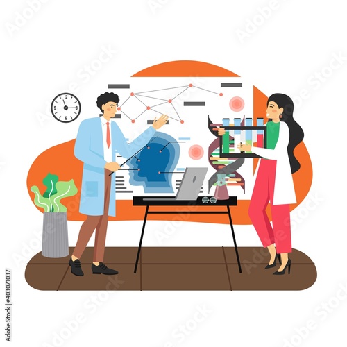 Сцена в научно-исследовательской лаборатории. Ученые мужского и женского пола в лабораторных халатах проводят исследования с использованием лабораторного оборудования, проводят презентацию, плоская векторная иллюстрация. Наука и образование.