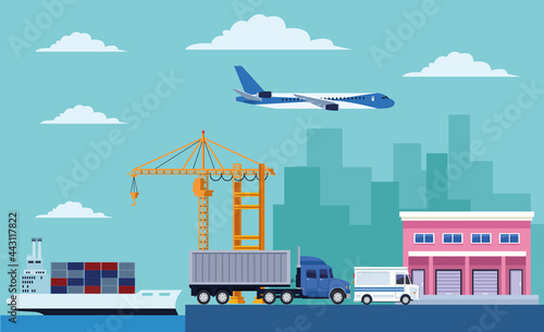 Вектор обслуживания морских грузов. Иллюстрация морского порта. Глобальная концепция международной логистики и доставки грузов. Большой корабль импортирует экспортную контейнерную коробку через океан по всему миру