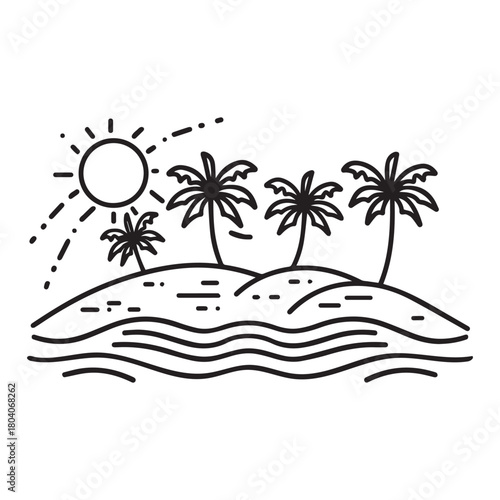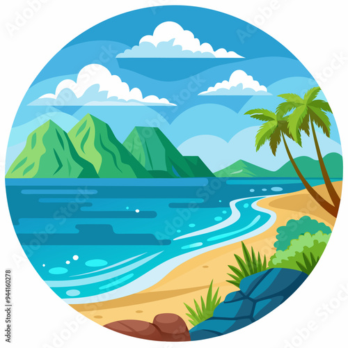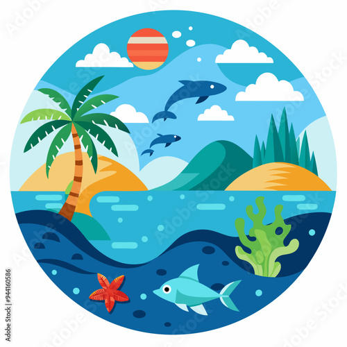 Морской круизный лайнер в океане над тропическим островом на фоне пальм и плавающих дельфинов. Пассажирское судно роскошный парусник, плавающий на поверхности воды летом векторная иллюстрация, вырезанная из бумаги