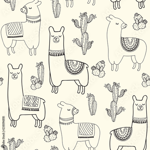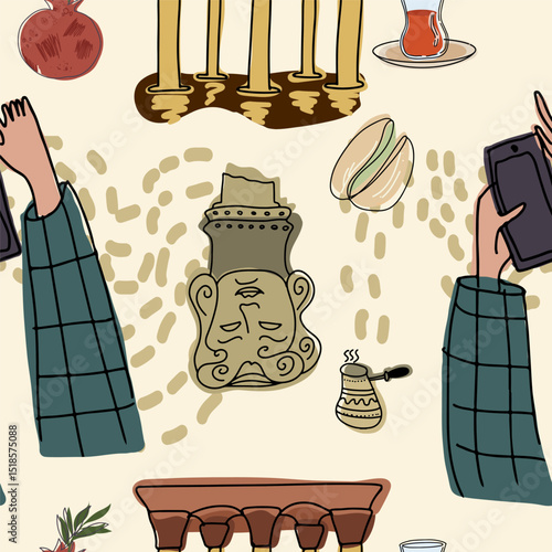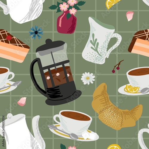 Бесшовный узор с кофейными и чайными предметами. Фон векторной иллюстрации. Кофе во французском прессе, чайник, чашки, торт и круассан.