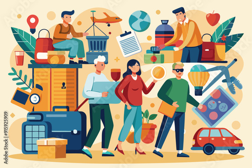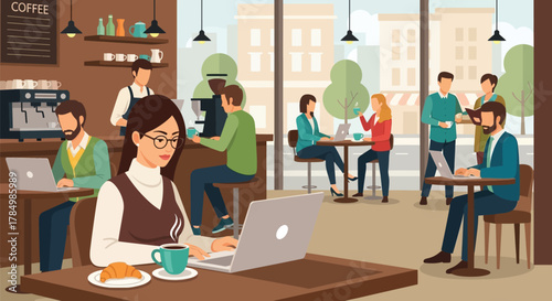 Сцена ателье с портнихой, модельером и персонажами заказчика, плоская векторная иллюстрация. Швея работает на швейной машинке, портной делает выкройки для шитья. Швейная мастерская, ателье.