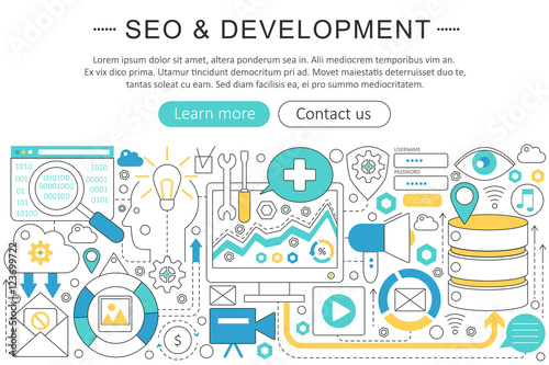 Поисковая оптимизация и веб-разработка плоских баннеров с тонкими линиями. Векторные концептуальные элементы и иконки.