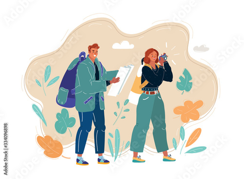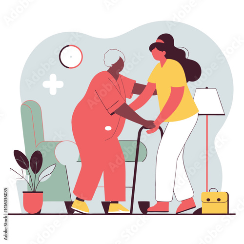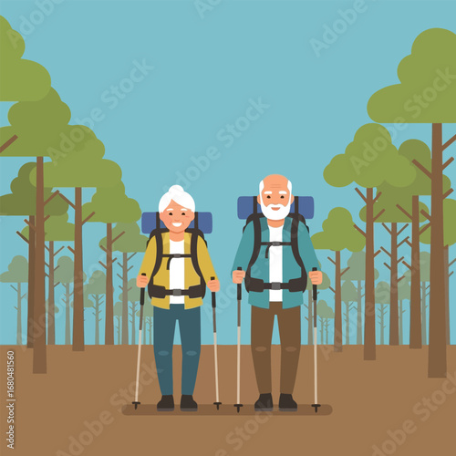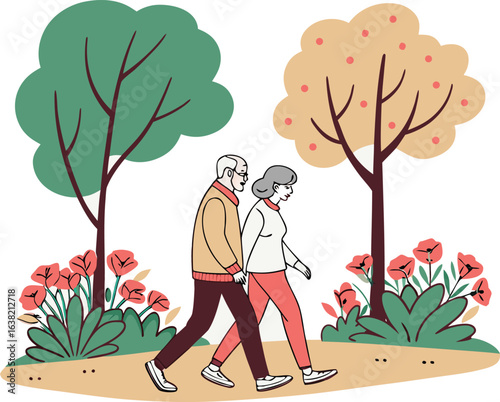 Пожилая пара прогуливается по осеннему парку с собакой. Векторный плакат концепции активного образа жизни пожилых людей. Романтическое свидание пары пожилых людей.