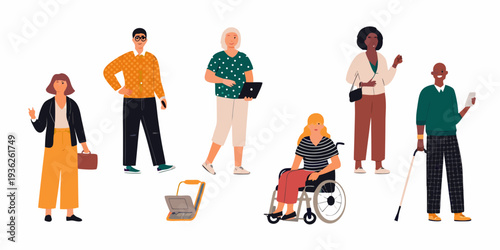 Векторный набор символов пожилых людей, изолированных на белом фоне. Пожилая женщина в инвалидном кресле, пожилой мужчина с тростью. Служба социальной помощи пожилым людям.