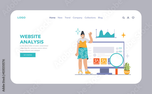 SEO snalytics и технологии цифрового маркетинга. Командная работа с приборной панелью поисковой оптимизации. Иллюстрация концепции. Векторный шаблон дизайна веб-сайта.