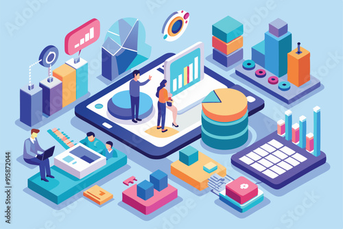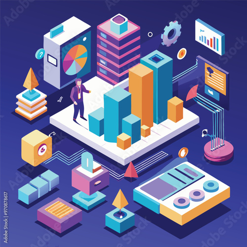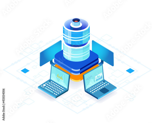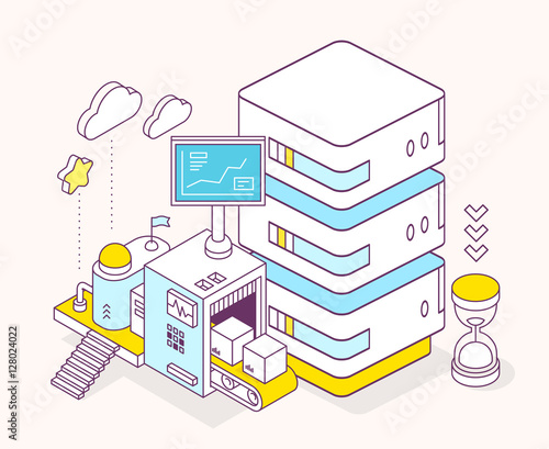 Серверные стойки, портативный компьютер и облако с замками, плоская векторная изометрическая иллюстрация. VPN, виртуальная частная сеть, интернет-безопасность.