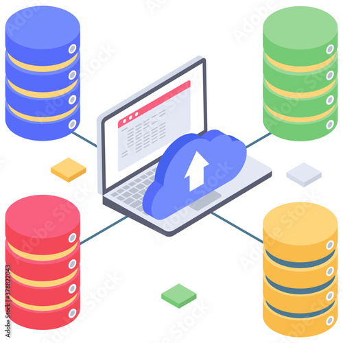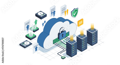 Серверные стойки, портативный компьютер и облако с замками, плоская векторная изометрическая иллюстрация. VPN, виртуальная частная сеть, интернет-безопасность.