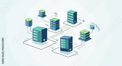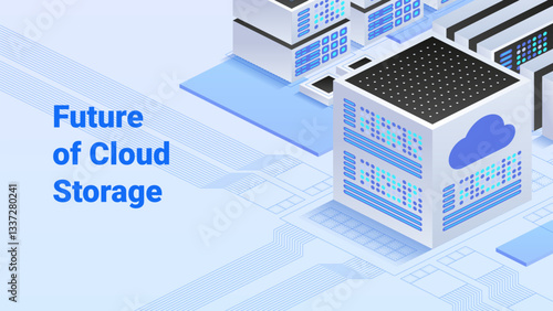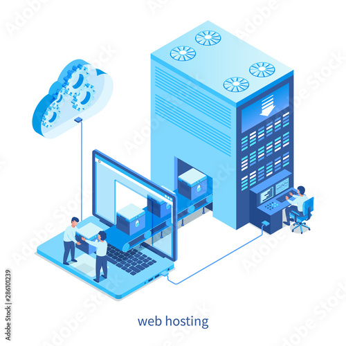 Серверные стойки, Wi-Fi маршрутизатор, портативный компьютер и облако, плоская векторная изометрическая иллюстрация. Скорость интернета на облачном хостинге.