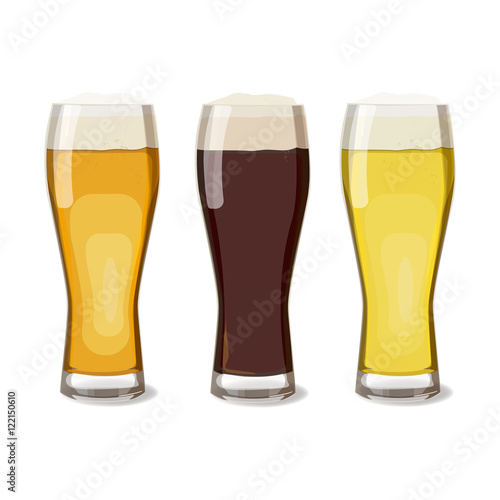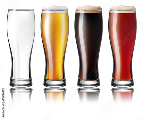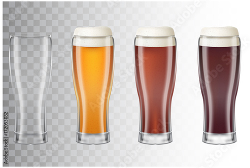 Набор реалистичных высоких пивных бокалов с различными основными сортами пива. Классическое светлое пиво, темное, красное и пустой бокал на прозрачном фоне. Векторная иллюстрация в 3d-стиле.
