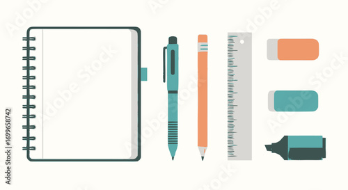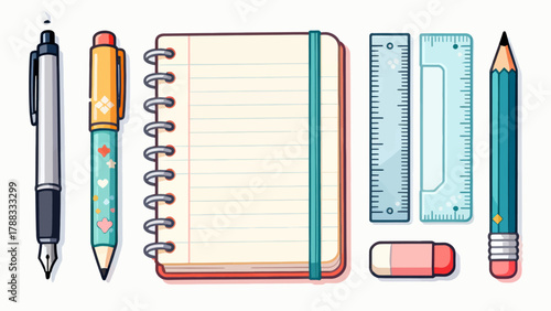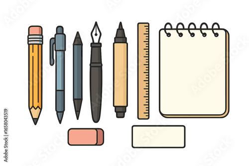 Набор инструментов для ручной надписи и векторной каллиграфии. Предметы первой необходимости для каллиграфии, такие как кисть, блокнот, наконечники и подставка для перьев, карандаш, чернила, маркер, ластик. Иллюстрация художественных принадлежностей
