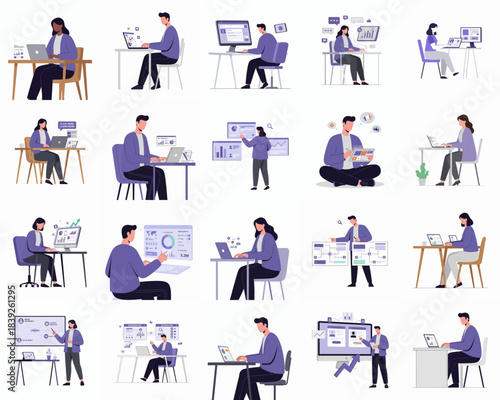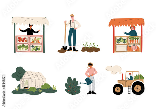 Набор мероприятий для деревенских жителей с различным специальным оборудованием. Кормление животных, разведение крупного рогатого скота, уборка урожая пшеницы, пчеловодство, копание, доение. Сельское хозяйство, фермерство. Плоская конструкция