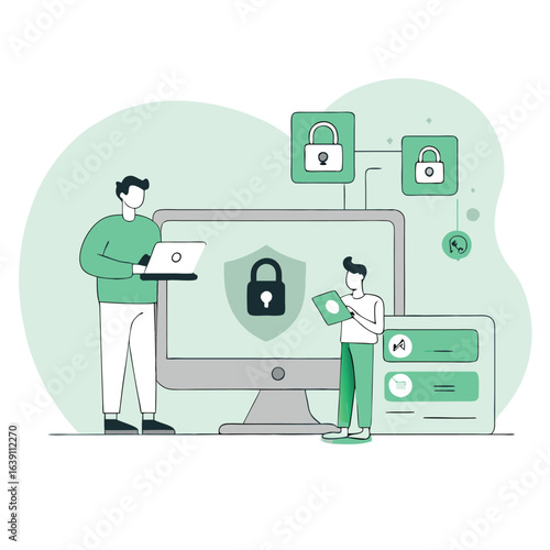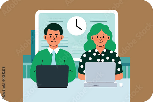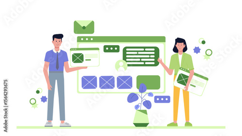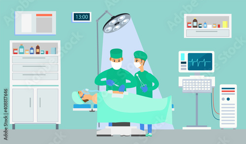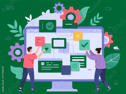 Векторная иллюстрация концепции установочных устройств. Два ученых, инженера или техника, работающие с измерительными приборами, элементы дизайна интерьера физической лаборатории в плоском стиле.