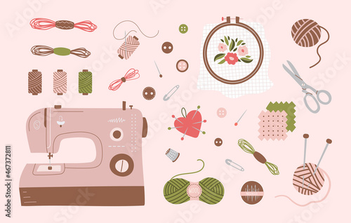 Иллюстрация дизайна векторного плоского стиля швейных услуг. Швейная машинка, пустышка, наперсток, булавки, подушечка для булавок, нитки, утюг, рулетка. Инструменты и оборудование для пошива веб-баннера, страницы веб-сайта и т.д.