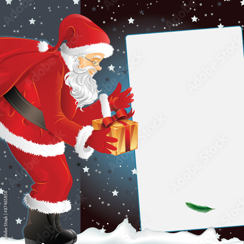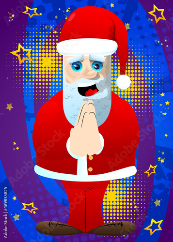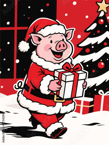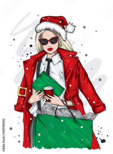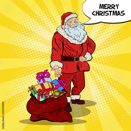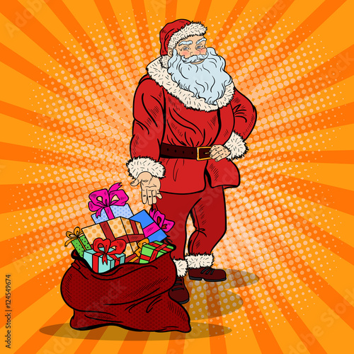 Сексуальная девушка-Санта в красном платье с подарком в руках. Векторная иллюстрация в стиле комического поп-арта. Концептуальный плакат рождественских праздников.