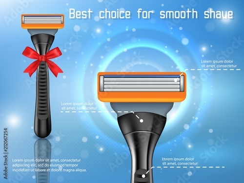 Реклама мужской бритвы для бритья. Векторная реалистичная иллюстрация макетов бритвы для влажного бритья с пространством для копирования. Лучший выбор для концептуального плаката с гладким бритьем, шаблона дизайна баннера.