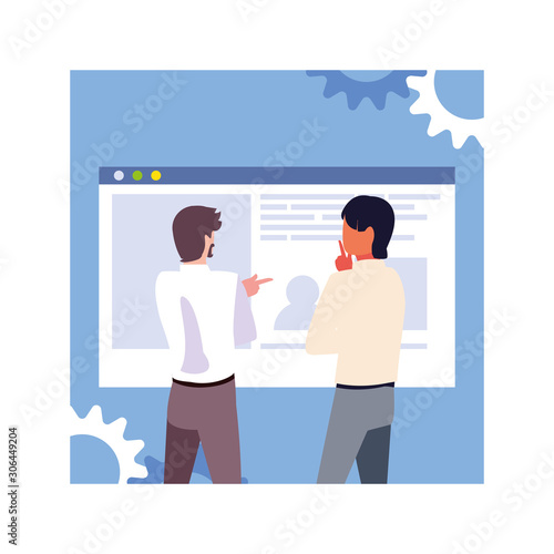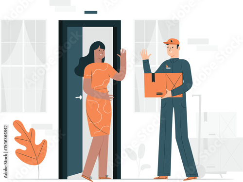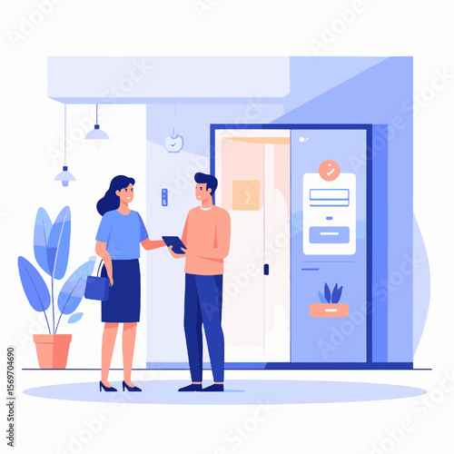 Продавщица помогает мужчине-покупателю выбрать модные очки для зрения в векторной иллюстрации магазина оптометрии. Посетитель мужского пола смотрит в зеркало, примеряя модный аксессуар для зрения